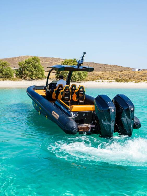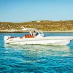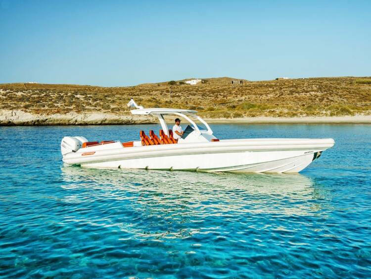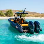 Luxurious boat transfer across crystal-clear waters aboard one of Mykonos’s finest speedboats